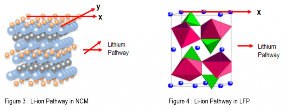 (NCA虽然分子结构与NCM稍有不同,但是存在的问题与NCM差不多) 虽然早期磷酸铁锂电池由于其结构原因,充放电效率较低(形象的说法就是由于结构稳定导致锂离子活动自由度不高),但随着包碳技术(法国世界级锂电科学家米歇尔·阿尔芒发明,并后来与古迪纳夫一起申请了专利,MichelArmand),以及纳米化材料工艺的技术,现在磷酸铁锂电池的充放电功率(即性能)不比三元锂电池差。 其次,LFP安全性高。磷酸铁锂化合物本身的分解温度在700~800度左右,远高于三元锂化合物的200~300度,所以理论安全性高很多;且三元锂电池在发生“热失控”时,会释放氧气,从而进一步加剧反应剧烈程度,而磷酸铁锂化合物中P-O键稳固,难以分解从而杜绝氧气形成,避免连锁效应。 但是,之所以磷酸铁锂一直没能应用于乘用车市场,根本原因在于LFP有几个“原罪”。 首先,LFP的能量密度较低。单电芯目前最顶端也就刚摸到三元锂电池的一般水平。原因在于相比于三元锂来说容量低(单位Ah),且电压低(三元大多在4V以上,磷酸铁锂在3.4V左右),能量即是容量乘以电压(单位Wh)。 其次,最要命的是低温性能差。原因在于正极材料(磷酸铁锂化合物)本身为绝缘体,相比三元锂电池电子导电率低,低温下导电性更为差,致使电池内阻增大,受到极化影响大。即便在加了纳米碳导电剂改良后,虽然有所缓解,但仍未能解决低温的电压降低导致的可用容量降低的问题。