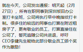 有人人车深圳员工便表示,在接到所有在职同事到深圳坂田办公室打卡坐班,公司将执行早中晚指纹打卡制的通知后,很多住的较远的同事也打算在附近租房子了,更有敬业的员工,打算直接住在公司了,“誓死追随公司共进退!” 当然后面这一句,是反讽而已。 |