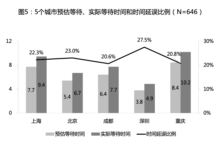 不查不知道,一查不得了,原来除北京外,扬招是各城市打车最快的首选。这和我们在2017年做过的小范围打车软件调研的结果仍旧保持一致,要想快上车,街头去扬招!不过扬招等候的体验和在室内叫好车再出门还是有差别的,尤其是在恶劣天气状况下,所以,您自个儿想清楚喽! 2. 平台会玩时间游戏吗? 您可能心中犹疑:扬招这么好,但我心里没底啊,打车软件至少还能告诉我需要等多久呢! 那么让我们来看看,平台软件们显示的预估等待时长真的准确吗?先奉上我们的结论吧:平台往往会向乘客呈现比实际更短的等待时间,以此提高乘客等待时的耐心。 5个城市打车预估等待时间全部显著低于实际等待时间(P<0.05)。