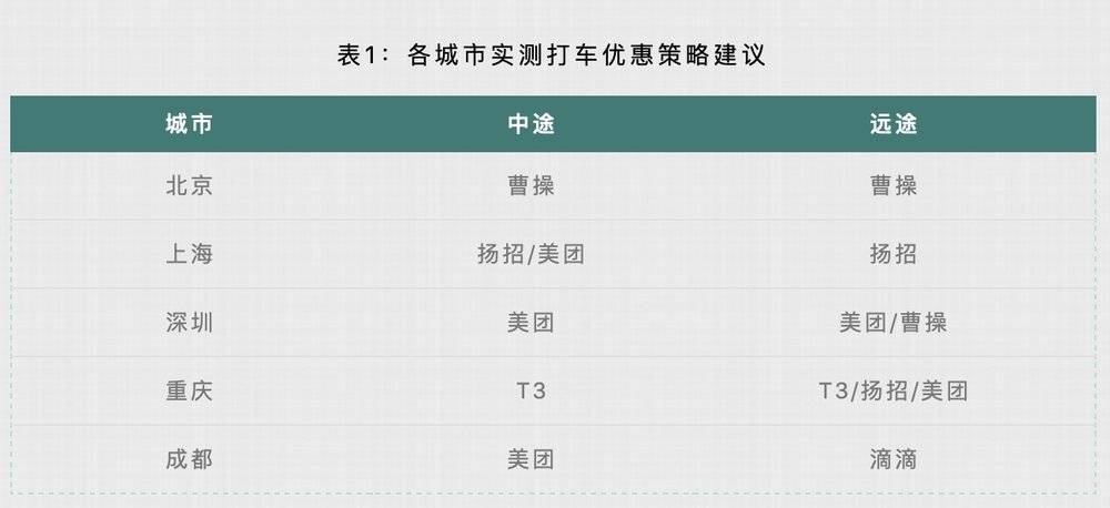 通过分城市的数据,我们也分析出了每个城市打车最优惠的选择,不信您自己去试试看吧!