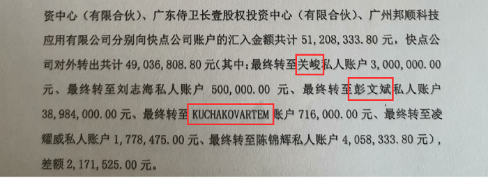 江门市新会区公证处公证文件中,侍卫长卫星原出纳的手机微信群中,彭文斌、李健辉、许杰安等人在计划安排资金走账 聊天记录和附件显示,2016年7月以来,由彭文斌下达指令,李健辉安排,黄美珍等人实施,用小笔金额在彭文斌控制的公司与侍卫长卫星之间分批次循环走账。资金从彭文斌账户进入侍卫长卫星后,绕一圈又转了回去。 根据永泰会计师事务所出具的审计报告,2016年6月至2018年9月,彭文斌控制的公司累计向侍卫长卫星转入1.6亿元,同时转出1.6亿元,其中绝大部分回到彭文斌个人或其控制的账户,余下1000多万元用于支付新三板公司壳费和彭文斌收购公司小股东的股权。 其中,还有一笔71.6万元转给了Ceramics PRO技术的俄国代表。在耐享科技案中,彭文斌向法庭声称,从未与俄国代表有任何联系。