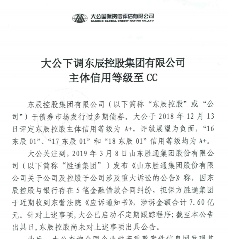 而据2019年4月3日下午大公资信发布的评级公告,已将东辰国际主题信用等级调至CC。
