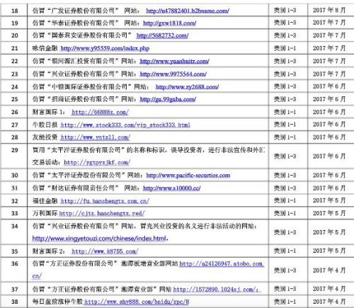 《非法仿冒证券公司、证券投资咨询公司等机构黑名单》显示,仿冒证券公司及证券公司营业部网站的情况较多,与广发证券、华泰证券等公司长相相似的李鬼,被揪出来曝了光;名称为宁波涨停敢死队私募、涨停板敢死队等网站为非法网站。