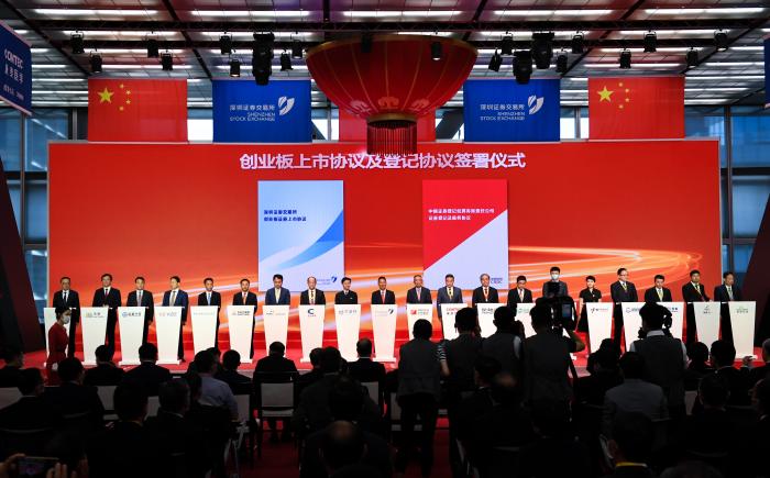 8月24日在深圳证券交易所举行的创业板改革并试点注册制首批企业上市仪式上拍摄的创业板上市协议及登记协议签署仪式。图 新华社