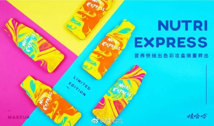 在微信公众号上,记者看到了这款“营养快线出色彩妆盘”,外形是娃哈哈经典产品营养快线的形状,包装配色炫目,分为冷色和暖色两个色调,配色十分大胆,每款都有9种颜色,十分吸引人。