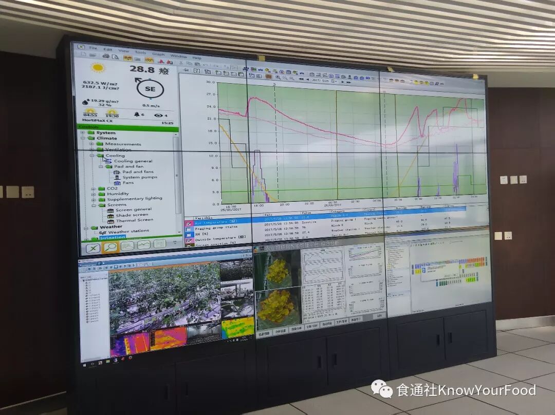北京一间植物工厂斥巨资引入荷兰的技术和设备,中控室可以监控和调整玻璃大棚的温度、湿度、风速等各种指标。 图|食通君