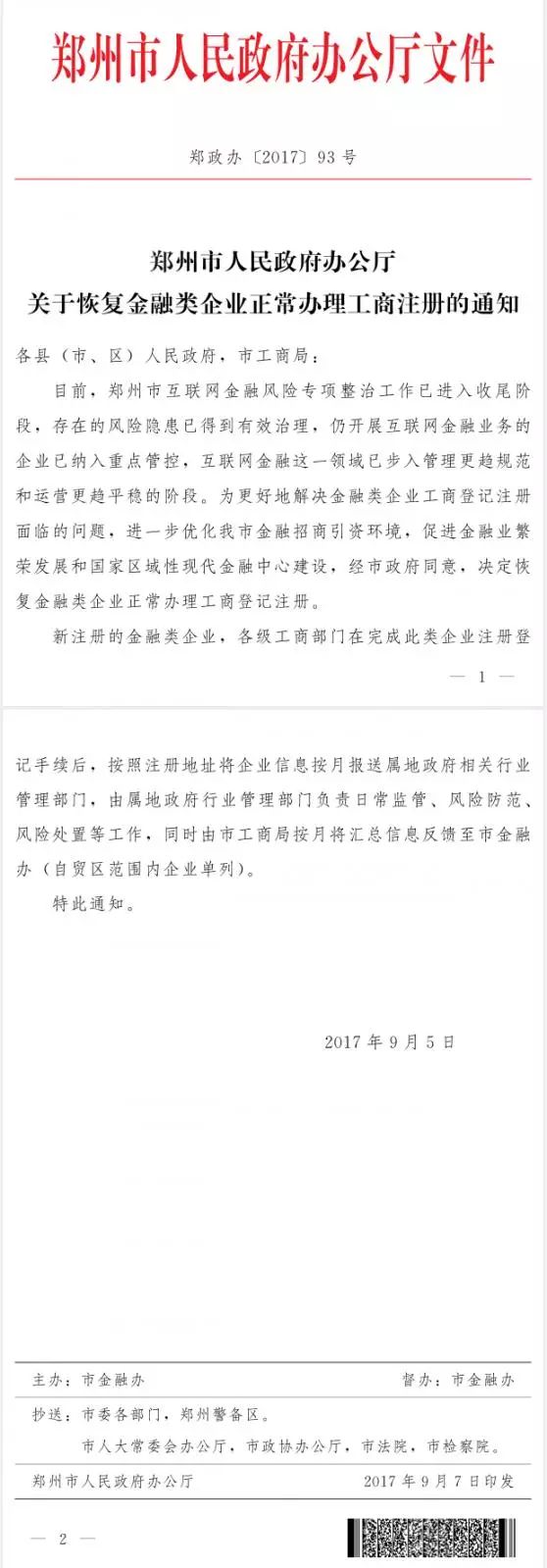 近日,郑州市人民政府办公厅下发《关于恢复金融类企业正常办理工商注册的通知》(下简称“通知”)。通知称,目前,郑州市互联网金融风险专项整治工作已进入收尾阶段,存在的风险隐患已得到有效治理,互联网金融这一领域已步入管理更趋规范和运营更趋平稳的阶段。为更好地解决金融类企业工商登记注册面临的问题,进一步优化金融招商引资环境,促进金融业繁荣发展和国家区域性现代金融中心建设,经市政府同意,决定恢复金融类企业正常办理工商登记注册。