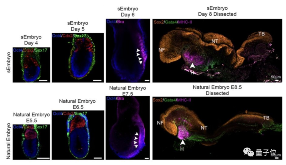 作者们将体外合成的胚胎结构与体内进行了对比,“该有的都有”: