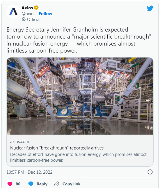 该消息最早由英国金融时报引述三名知情人士报导,美国加州劳伦斯利佛摩国家实验室(LLNL)运用一种称为惯性局限融合的过程,过去两周在一次核融合实验中达到淨能量增益。这种过程包括藉由当今全球最大的雷射,持续照射一个微小的氢电浆球。该核融合反应产生约二.五兆焦耳(MJ)的能源,约雷射能量(二.一兆焦耳)的百分之一二○。