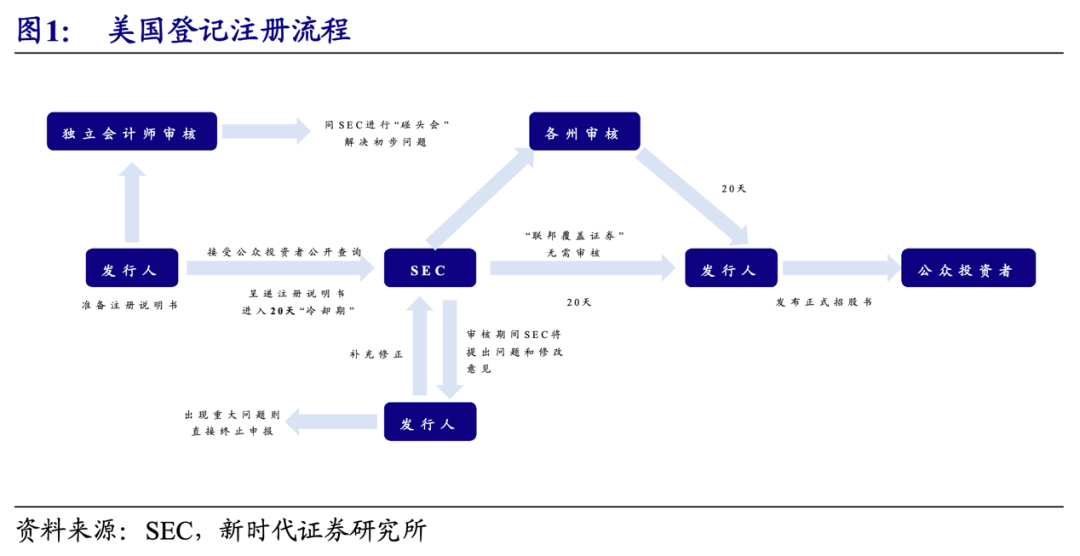 此前,市场存在对于美国的注册制有误解,认为美国只对发行申请人进行“形式审核”而不进行“实质审核”,实际上,美国实行的是双重注册制,即联邦层面由美国SEC对发行申请人进行“形式审核”,而州政府进行“实质审核”。