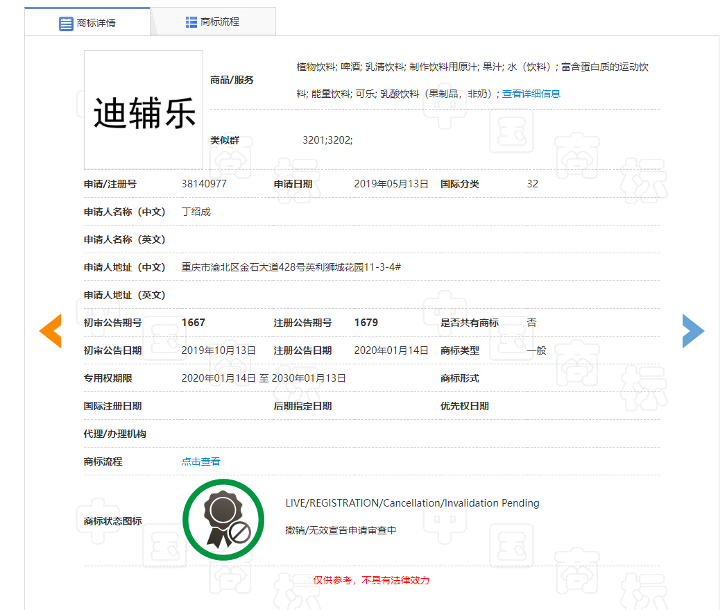 看似天衣无缝的表象下,实则不堪一击。第38196577号第32类“Dipro”商标,第38140977号第32类“迪辅乐”商标的核定使用范围为:植物饮料; 啤酒; 乳清饮料; 制作饮料用原汁; 果汁; 水(饮料); 富含蛋白质的运动饮料; 能量饮料; 可乐; 乳酸饮料(果制品,非奶)。
