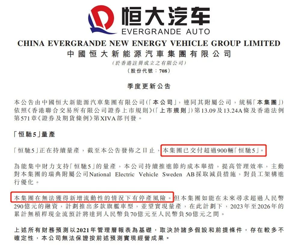 这可不是社长故意抹黑。“交付超900辆”、“面临停产风险”的字眼,都是恒大汽车3月22日在港交所发布的公告里,自己曝出来的。