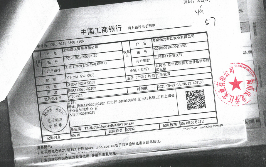 然而,《国际金融报》记者调查获悉,两笔未清偿应收账款之一的债务人保龙实业早在2021年5月21日、2021年5月27日已向原始债权人完整清偿了对应债务。保龙实业出具的银行流水显示,上海培信贸易有限公司先后向其支付15笔合计1.3亿元。保龙实业对应的给广州丰汇实业有限公司(下称“丰汇实业”)转入15笔合计1.3亿元。