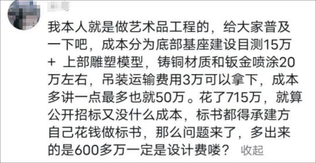 更有行业内人士分析,这个雕塑造价最多50万,715万简直天方夜谭。