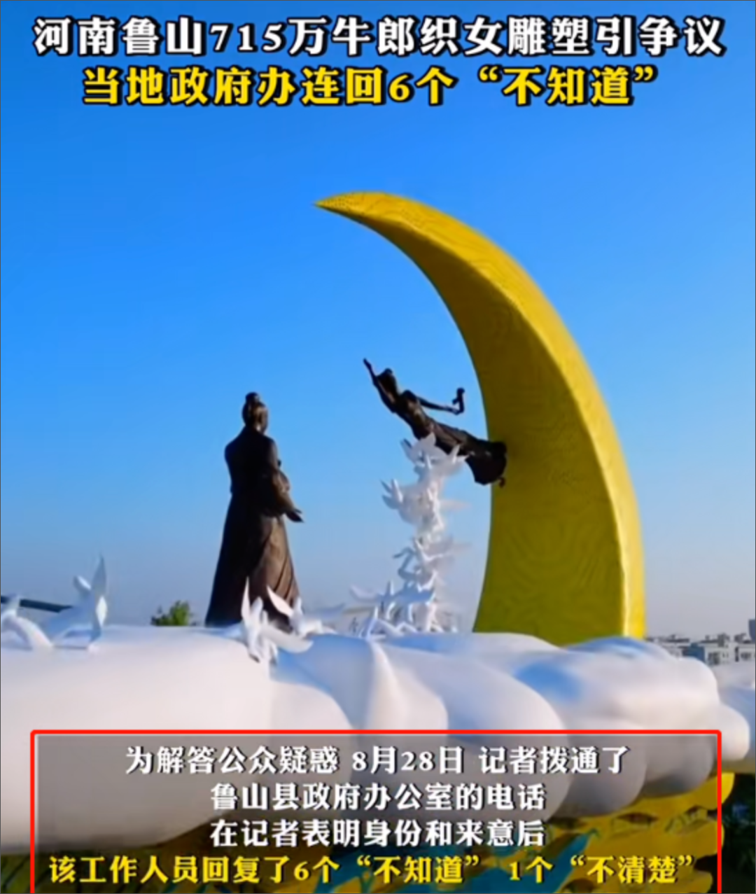 事情是这样的,鲁山县宣称自己是牛郎织女故事的发源地,于是打造了一个牛郎织女主题的雕塑,总花费715万,七夕节雕塑揭幕。