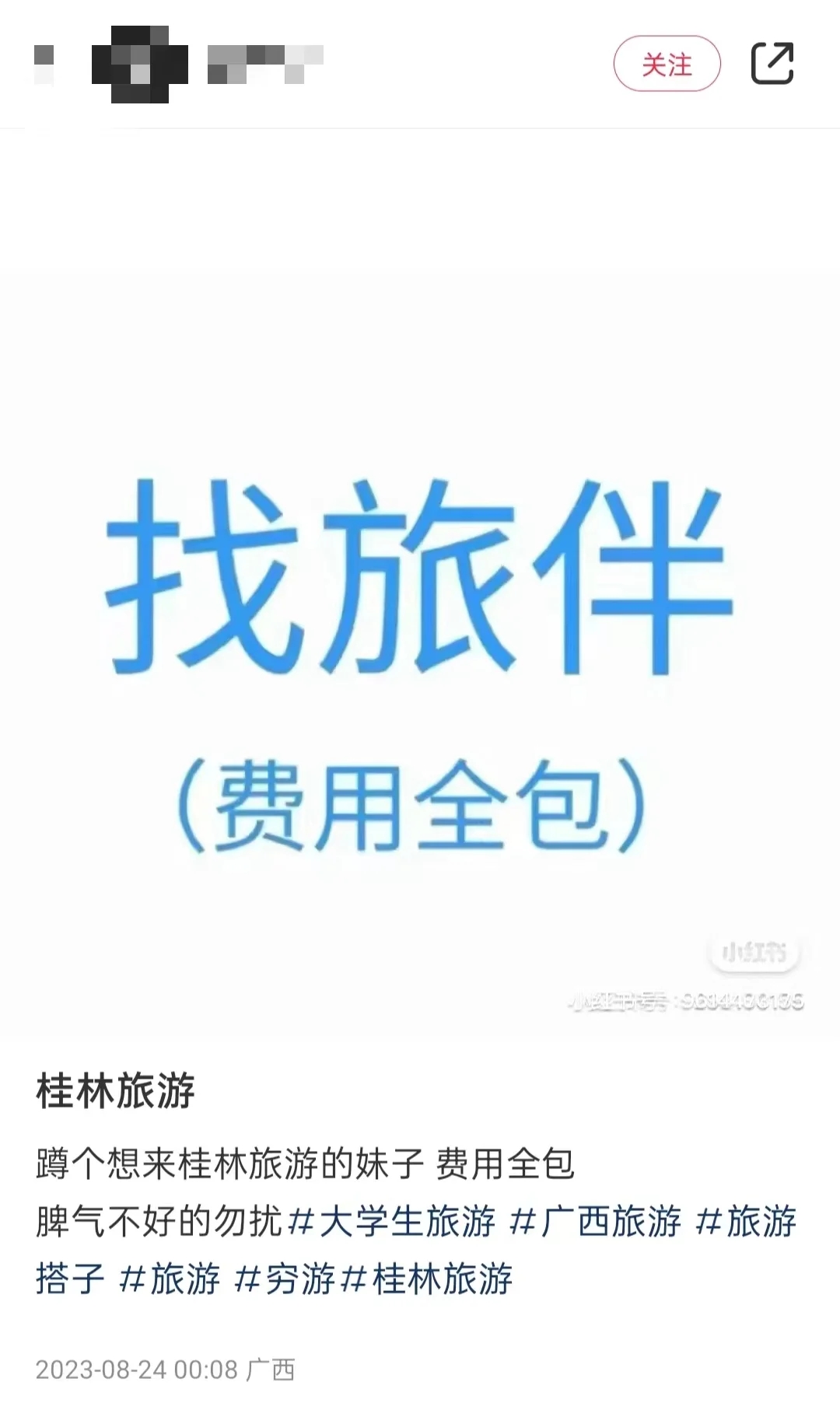 吃饭找搭子,看电影找搭子,剧本杀也找搭子……现代生活的快节奏让“搭子”成了年轻人社交的新兴形式。然而,在小红书上找旅游搭子时,有一种文案显示“仅限女生,费用全包”,这时可要提高警惕了:因为你想和他旅游,他却想……