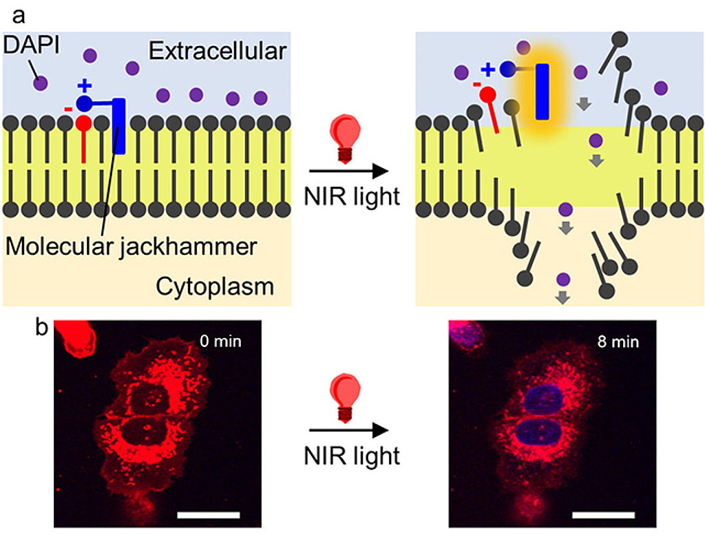 研究团队以图示说明,光线驱动分子震动,如何破癌细胞的细胞膜。