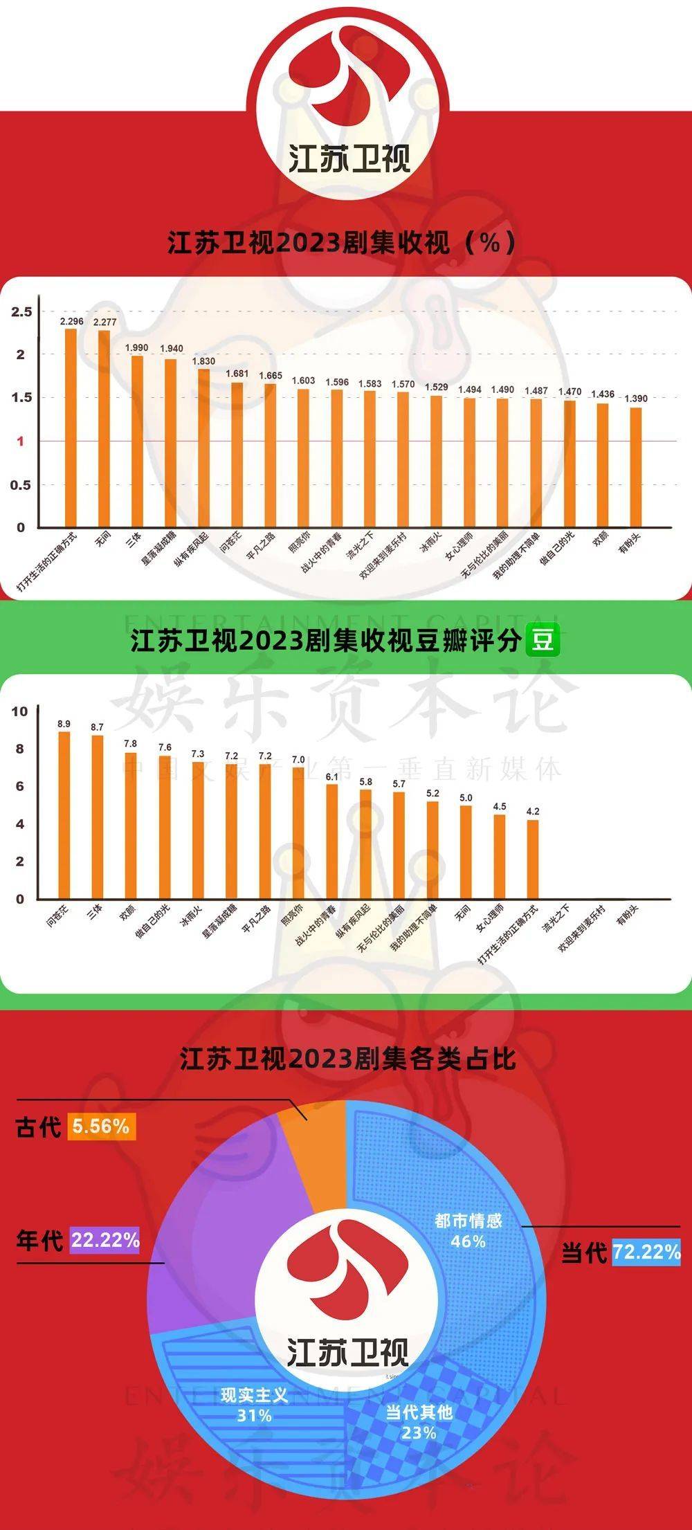江苏卫视晚间黄金档在2023年有两部收视破2%的剧集,与去年持平;其余剧集的平均收视率均突破1%。除革命献礼剧《问苍茫》和当代都市剧《平凡之路》之外,江苏卫视黄金档剧集均为卫视首播。其中,新剧占全年黄金档剧集数的66.67%,较去年的56.25%有较大增长。整体来看,江苏卫视在深耕高质量内容的同时,亦兼顾了类型创新。