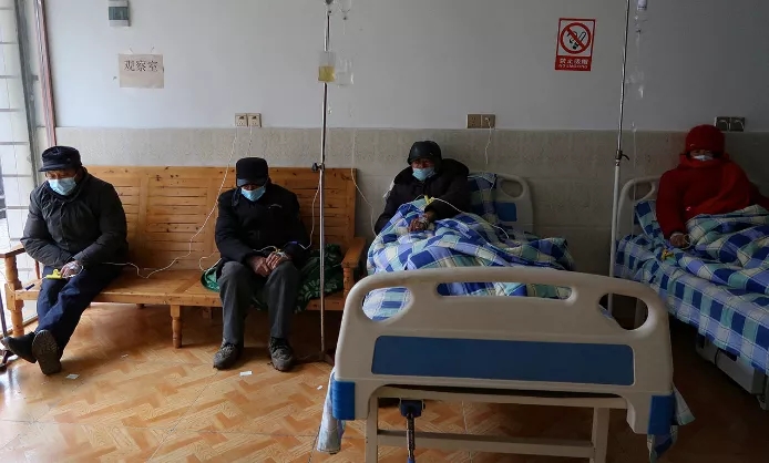 2023年1月3日,一名老人在北京医院急诊室的走廊上接受静脉输液