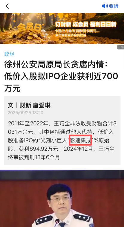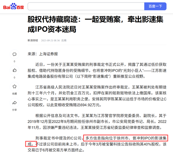 风波的起点是一份刑事裁定书:徐州落马官员王某某,在C公司IPO前,安排其利益伙伴陈某某低价突击入股,从中变相受贿694.92万元。而在9月21日《上海证券报》的报道中,这家裁判文书里神秘的“C公司”被明确指向曾经冲刺IPO无果、有着“光刻小巨人”之称的影速集成。