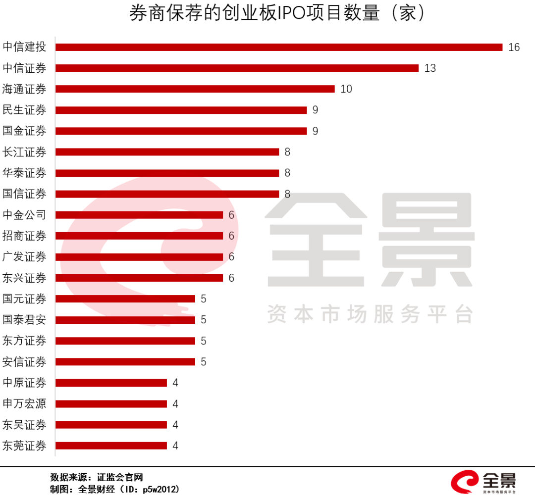 证监会最新数据显示,创业板IPO排队企业中尚未过会的184家。保荐企业数排名第一的是,中信建投证券,保荐项目数量达16家;排在第二的是,中信证券,保荐13家;排在第3位的是,海通证券,保荐10家。