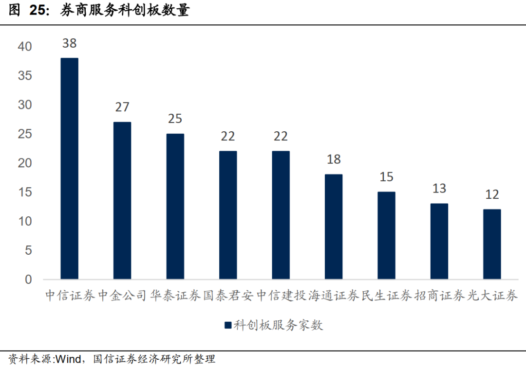 从科创板成立至今,IPO项目主要集中在龙头券商。其中,中信证券的项目数量为38家,位列第一,中金公司、华泰证券分别为27家、25家,分别位列第二、三位。