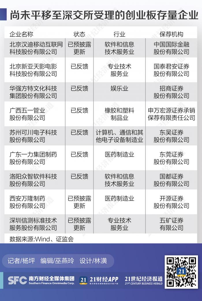 这也就意味着,目前尚未在深交所官网披露受理信息的在审企业,还有抢先过渡期完成申报的机会。北京一名券商投行人士曾向记者预测,在审企业不会全部符合条件被受理。